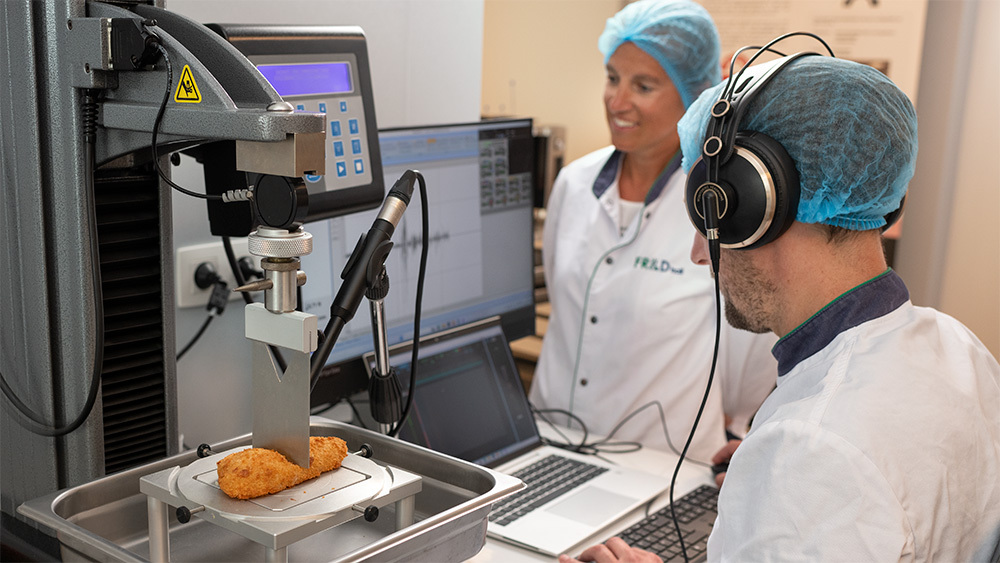 “Wij vroegen ons af of het mogelijk was om tóch die perfecte crunch te behouden. We hebben daarom een objectieve meetmethode ontwikkeld om de krokantheid van producten te bepalen: we gebruiken daarvoor een ‘texture analyser’ en een microfoon die het krakende geluid opneemt als het voedingsproduct wordt doorgesneden met een speciaal mes. Elk geluid genereert een piek op de grafiek, en het aantal en de hoogte van die pieken zijn een maat voor de krokantheid. We gaan ons streven naar de ultieme crunch nu voortzetten in het vervolgproject ‘Krak’.”